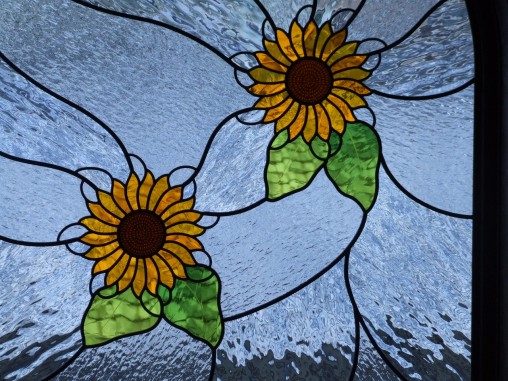 築30数年のお家の吹き抜け窓2箇所と 玄関ドア上の欄間に設置させて頂きました。 お客様のご希望デザインが青空の中のヒマワリと言う事で コチラのデザインとなりました。 ヒマワリに中心部分は絵付けで表現を付け 花びらの部分はランバーツのアンティークガラスを使用 鮮やかな明るいヒマワリとなりました! こんなステンドグラスがお玄関にあると毎日明るい気持ちで過せそうですね。 |