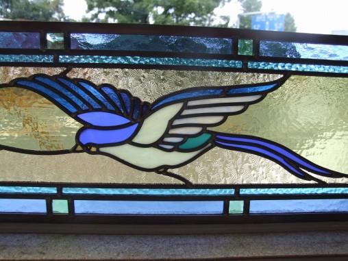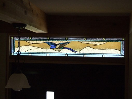 「青い鳥」のステンドグラスがお客様のご要望でした。 ご新築物件でしたが欄間のサイズが決定済みで、 ガラス部分の高さがなかったので少しデザインには苦労しましたが、 ガラス部分の高さが無い窓の中でも美しく空を羽ばたく青い鳥を描けたと思います。 『お客様からのご感想メール』 ステンドグラスは想像以上に素晴らしく、玄関を通るのが楽しみです。 これから長く付き合って行きたいと思っております、 スタッフの皆さまにも宜しくお伝え下さい、有難うございました。 |