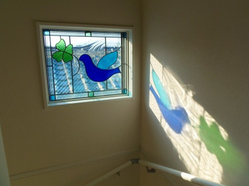 ステンドグラスの専門店戸夢窓屋 > 施工実績 > 戸建&マンション宅 > (19)兵庫県尼崎市O様邸 階段室はめ殺し窓 青い鳥 お客様のスケッチを元に制作