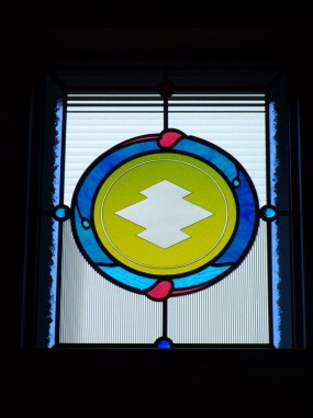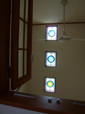 ステンドグラスの専門店戸夢窓屋 > 施工実績 > 戸建&マンション宅 > (32)大阪府箕面市 リビング吹き抜け はめ殺し窓 フクロウ・ヤタガラス・家紋
