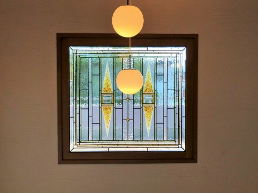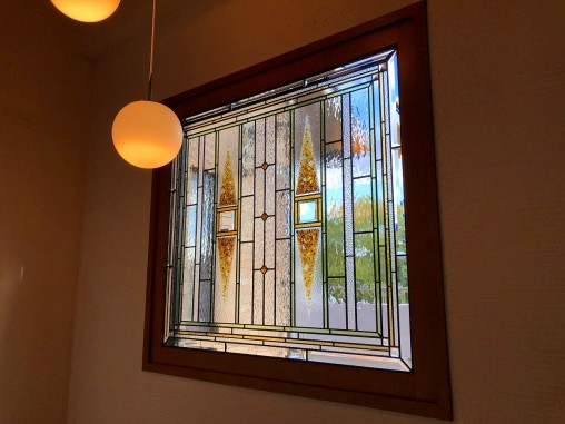 ステンドグラスの専門店戸夢窓屋 > 施工実績 > 戸建&マンション宅 > (138)大阪府門真市T様邸 玄関ホール吹き抜けはめ殺し窓 偽物ステンドグラス劣化にて交換(写真あり)