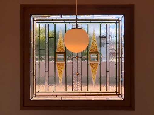 玄関正面のはめ殺し窓に設置された偽物ステンドグラスですが、 約20年程前の購入時は偽物だと分からず購入されて、 色の変色、ポロポロと剥がれてきた事で偽物だと気付かれたとの事でした。 玄関の正面上部に設置された1200ミリ□の大きな吹き抜け窓でしたので お客様曰く「偽物は恥ずかしい」との事で、 本物のステンドグラスをご採用頂きました。 一枚モノとしてはサイズが大きかったので、 まずステンドグラス本体の強度については十分注意して制作をさせて頂き、 設置工事の際にはローリングタワーを手配して 安全に設置をさせて頂きました。 |