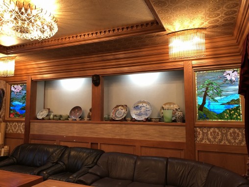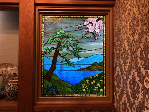 ステンドグラスの専門店戸夢窓屋 > 施工実績 > 戸建&マンション宅 > (117)奈良県生駒市F様邸 応接間 はめ殺し窓 風景&和柄(サクラ.松.ツツジ) 施工前後比較写真・偽物ステンドグラス劣化にて交換(写真有り)