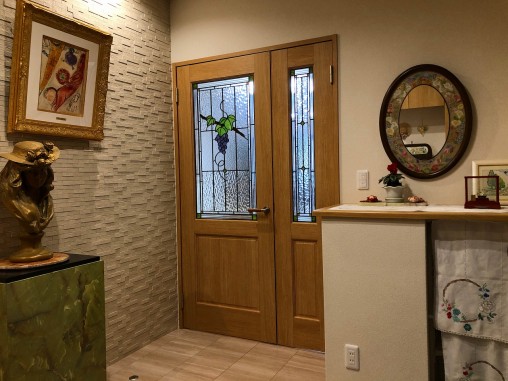 積水ハウス様にてご新築時にステンドグラスを納品させて頂きました。 親子ドアは積水ハウスの既製品、工房に持ち込んで頂き 工房にてステンドグラス設置、ステンドグラスが設置された ドアの設置は建築会社様にてご対応を頂きました。 ・設置後のお客様の声・ 素晴らしいステンドグラスを制作頂き有難うございます 設置されてから毎日嬉しく眺めてます、 時間帯によっても見え方が変わるので1日中楽しめます、 ガラス使いが本当に素晴らしい、 ブドウの実、葉、枝、どのガラスも大好きで 使用ガラスもお任せして良かったです。 ケイム(金属部分の)巾も繊細で良い、 ブドウがかわいらしくてとても好き、 子ドアのデザインと使用ガラスも 親ドアの良い部分を上手に取り入れて下さって感謝しています。 元々他社への注文を決めかけていましたが、 ステンドグラスの出来上がりにも大満足ですし、 ショールームで現物が沢山見れたり、 建築業者様への対応や、適切なアドバイス、 納品までの色々なやり取りを含めて、 戸夢窓屋さんにご依頼をして本当に良かったと思っています、 有難うございました。 |