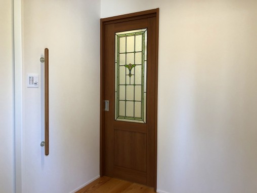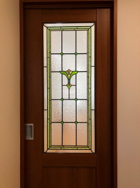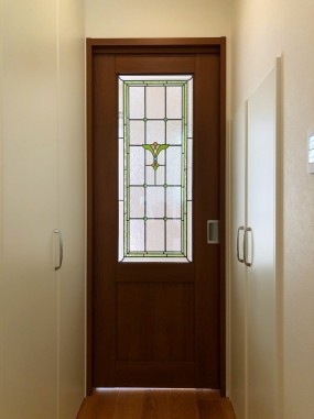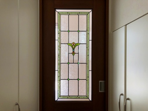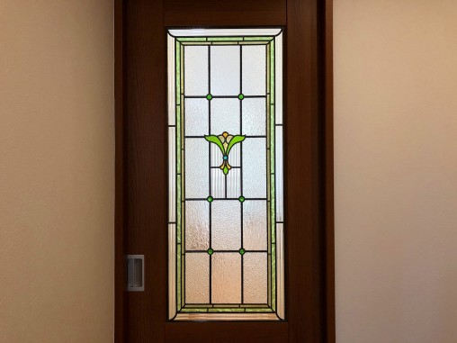 積水ハウス様にて新築時に既製品の引戸に ステンドグラスを設置させて頂きました。 セミオーダーTW-12をベースにサイズに合わせて デザインを追加させて頂き、デザインの変更に合わせて 色ガラスに使用箇所なども変更させて頂きました。 |