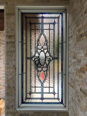 ショールームのサンプル(最後の写真)と同じデザインのステンドグラスを 大幅にサイズで変更をして描き直し、 お客様のご希望変更を少し加えて作製させて頂きました。 (173)リビング入口ドア&(174)玄関の窓は同じデザインで サイズ違い&(175)キッチンの窓は同様の面取りガラスを使用して 色ガラス透明ガラス部分は同じガラスを使用しております。 |