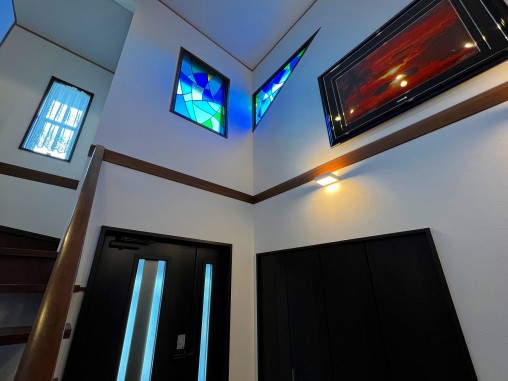 ステンドグラスの専門店戸夢窓屋 > 施工実績 > 戸建&マンション宅 > (186)奈良県奈良市S様邸③ 玄関吹抜けはめ殺し窓 サグラダファミリアイメージ 目隠し対策 施工前後比較写真※お客様の声有り