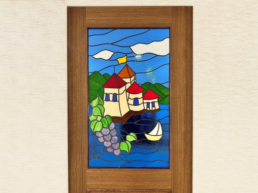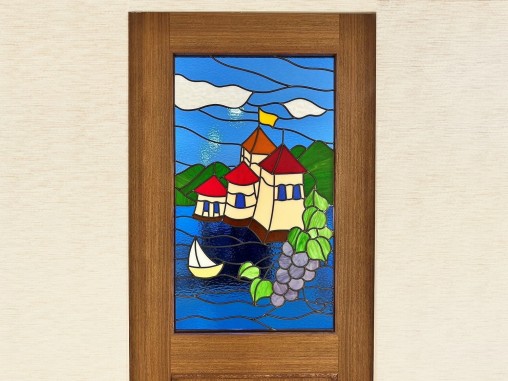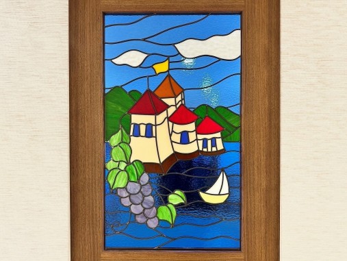 お客様のご希望イメージを元に建築業者様がスケッチを描かれ、 そのスケッチを弊社でステンドグラスの図案化させて頂きました。 お客様のご要望はスイスにあるシヨン城と大き目の葡萄とヨットをデザインに入れたい、 デザインはアニメチックなイメージがお好きで、 ご予算的な事もあり弊社でアドバイスをさせて頂きながら、 建築業者様とお客様の間でデザインや色目などのやり取りを重ねて頂き、 ご希望内容が絞れてから、実際の使用ガラスの確認をさせて頂き、 全ての確認を終えてからステンドグラスの制作をさせて頂きました。 ちなみに最終的に旗はお客様のご希望により黄色となりました。 |