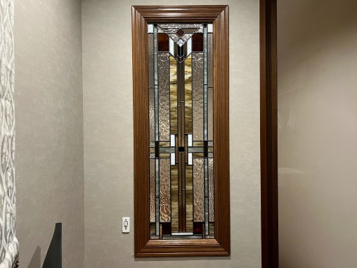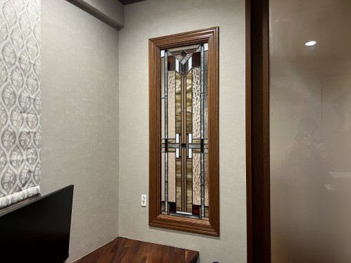 1Fリビングにステンドグラスを設置(施工事例165)をさせて頂いてから 約2年後に追加でご注文を頂きました。 今回はご主人の書斎という事で、 男性的なデザインと色目、あと廊下からに書斎内部が見えないように 全面目隠しが強いガラスを使用して制作をさせて頂きました。 |