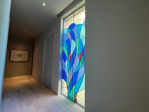 幅が約1000ミリ 高さが約2600ミリとサイズが大きいので 二枚のステンドグラスを繋ぎ合わせて高い強度を保っています。 ベースのデザインは弊社ホームページに掲載している過去の事例から、 ご希望のデザインをお選び頂きご希望サイズに合わせてデザインを調整、 使用ガラスも調整してお客様の思い出の地であるレマン湖を表現や お客様の苗字、経営されている会社名も含めて表現。 レマン湖は具象的では無く、 湖の青い感じだけの表現で良いとのご要望でしたので、 青色のガラスを使用し、水の動きや波の感じをデザインで表現。 背景のデザインと全体的な色ガラスは他のお部屋との調和をとりました。 又、プライベートなスペースでしたので室内が見えないように目隠しにも 配慮したガラス構成に致しました。 ※ご両親のご自宅など5年以上前から追加注文を数回頂いているご物件です。 |