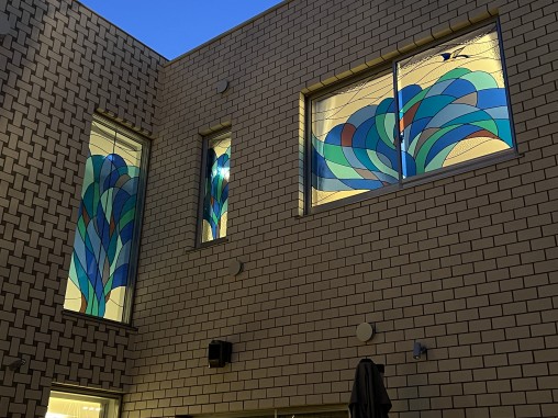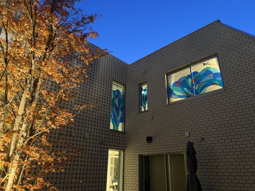 ステンドグラスの専門店戸夢窓屋 > 施工実績 > 戸建&マンション宅 > (213)大阪府藤井寺市H様邸 ホール&廊下 はめ殺し窓(大型の為2枚連結) 施工前後比較写真 目隠し対策 アーネストホーム