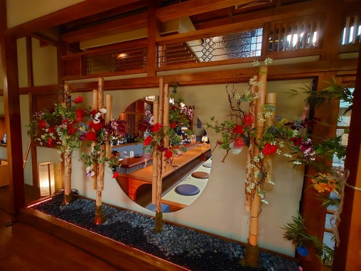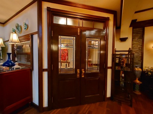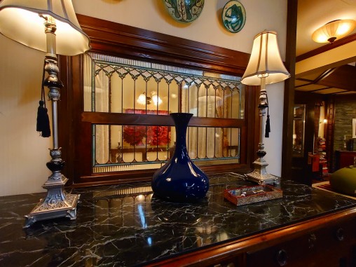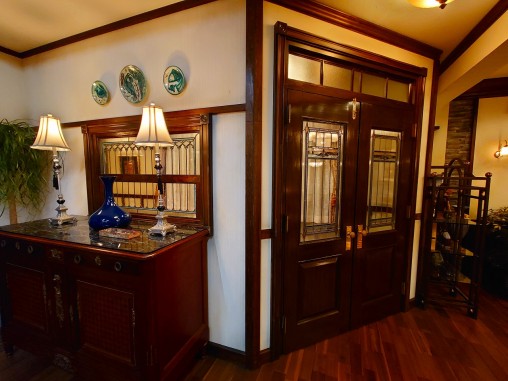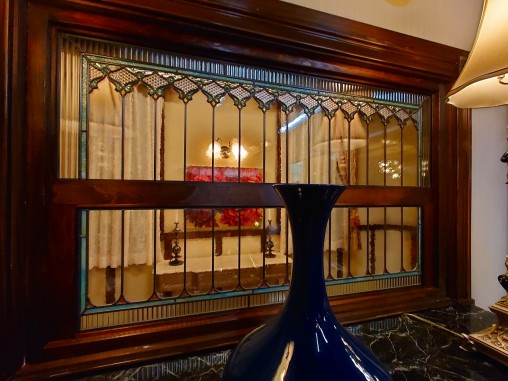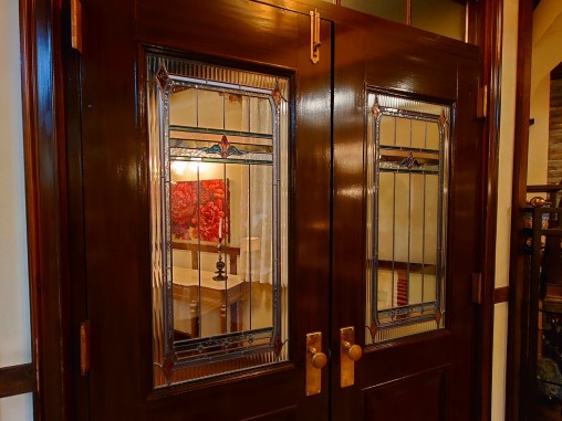 洋館セットのドア(2枚)と間仕切壁(2枚) 旅館セットの欄間部分(4枚) 合計8枚ステンドグラスが設置されております。 |