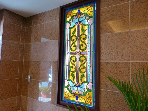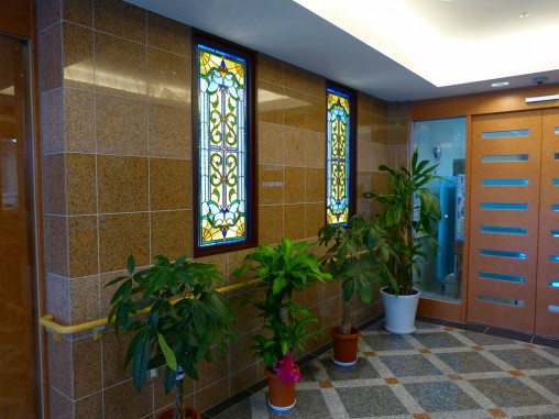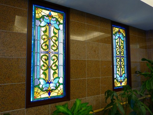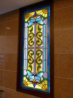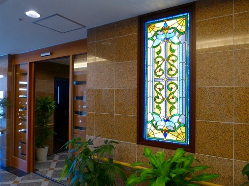ステンドグラスの専門店戸夢窓屋 > 施工実績 > 店舗&公共施設 > (30)大阪府堺市老人ホームシャローム晴れる家3号館様 エントランスホール LED内蔵ステンドグラス