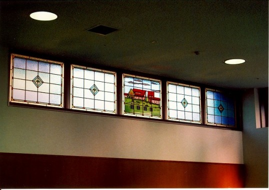 病院設立当時に描かれた油絵を元にステンドグラスをデザインさせて頂きました。 油絵の部分は絵付けの技法を使い出来るだけ油絵に近いイメージで 少し時代を感じるような表現にしました。 全体としては病院の玄関ホールのイメージを明るくされたい、と言う 要望にお応え出来るように色使いにも配慮してステンドグラスを制作し、 ホール全体が明るい雰囲気になりました! 玄関の雰囲気を明るくする事で 病院全体のイメージにも非常に良い影響があったとお喜び頂けました! |