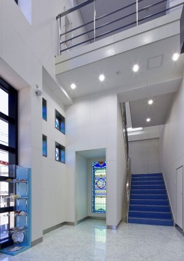 大阪府豊中市にある水産加工会社の株式会社東和シーフーズ様に 納品させて頂きましたステンドグラスです。 オーナー様が美しい自然と海をスゴク愛されていて ご趣味でスキューバーダイビングや貝殻の収集をされておられます! オーナー様のリクエストは「キレイな海」「熱帯魚と珊瑚」 「全体的にはクラッシクなデザイン」 そして「全面色ガラスでインパクトのある作品」との事でした。 オーナー様のリクエストをベースに宇宙の中の美しい地球と 自然そして美しい山が美しい海を作ると言うイメージを持って デザインをさせて頂きました! 「キレイな海」「熱帯魚や珊瑚」はス テンドグラスの中心にメダリオンとしてフュージングで表現し 作品の上部の山の部分もフュージングを使用いたしました! 太陽のオレンジメダリオンの周りのパープルボーダーのマルチカラーは 最高級アンティークガラス「フリモント」を使用しております。 エントランスホールに約W700ミリ H2000ミリの作品は本当に迫力があり、 水産加工会社らしい「海」をイメージした 素敵な作品に仕上がったと思っております! 玄関ドア横にある約400ミリ□の窓にもメインのステンドグラスに合わせて フリモントのブルー&グリーンのガラスをメインに使用した ペアガラス内蔵のステンドグラスを4枚設置させて頂きました! 一般住宅でも住宅以外の建築物件でも お客様から色々なテーマを頂いてステンドグラスを制作させて頂きますので お客様が新しいデザインに導いて下さると思っております! このたびは東和シーフーズ様に素敵な機会を頂きまして 誠に有難うございました! |