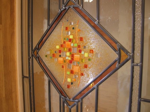 デザインのメインテーマは、 お年寄りの方々が癒されるような優しく上品な雰囲気を作ること! そこで各箇所ごとに、お花をイメージとしたテーマ色に決める事にしました! 桜 ⇒ ピンク ハナミズキ ⇒ イエロー&グリーン サルスベリ ⇒ パープル もみじ ⇒ オレンジ ステンドグラスだけで表現すると具象的になってしまうので、 フュージンググラス(真ん中の色の部分)を絡めて優しい感じに仕上げました。 |