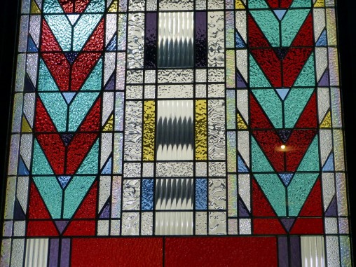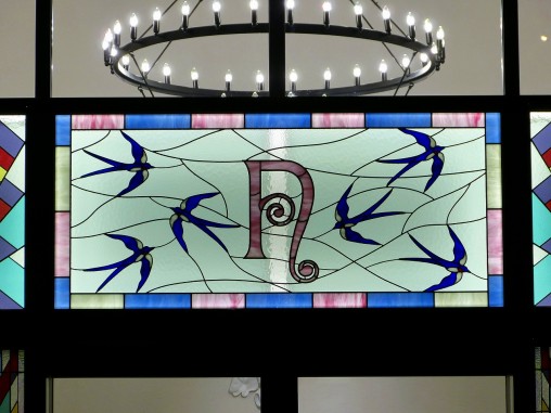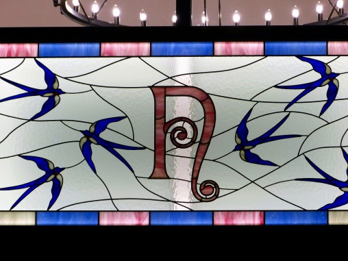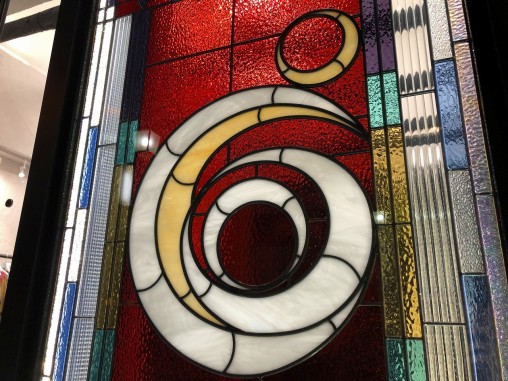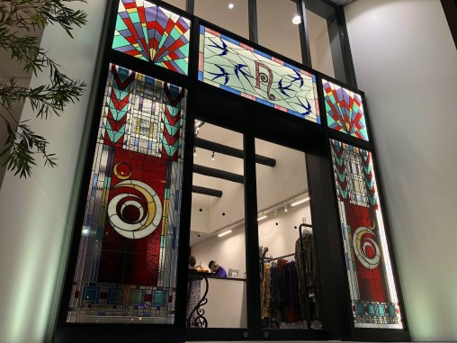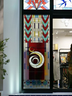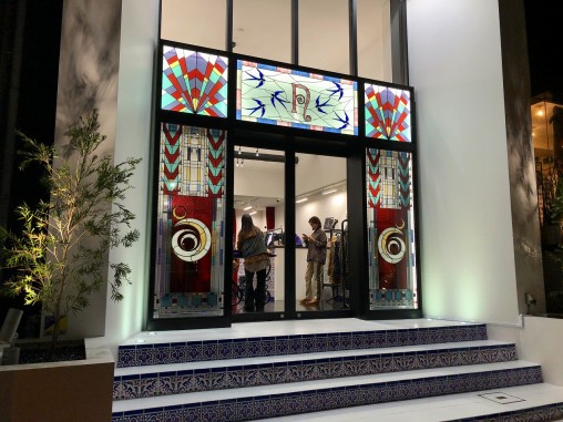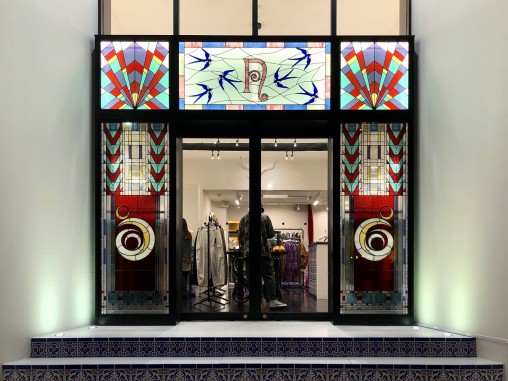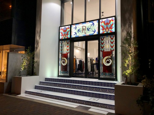 ステンドグラスの専門店戸夢窓屋 > 施工実績 > 店舗&公共施設 > (55)大阪市西区NEPENTHES WOMAN OSAKA(ネペンテス ウーマン大阪)様 エントランス LED内蔵ステンドグラス お客様の原図を元に制作 ロゴマークを採用
