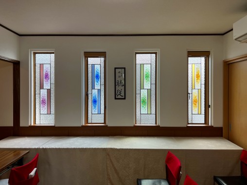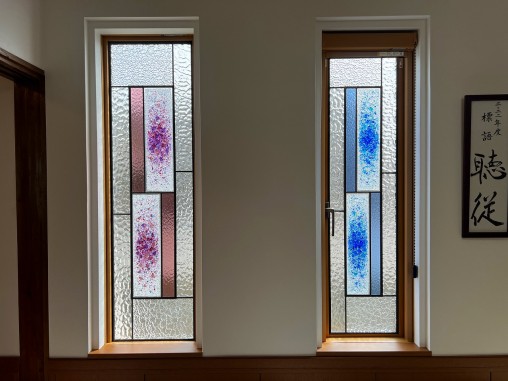 <礼拝堂20枚> ・はめ殺し窓ステンドグラス 10枚 (既存のカスミペアガラスに貼り付け) ・たて滑り出し窓(開閉窓)ステンドグラス 10枚 (既存のカスミペアガラスに貼り付け) 既存のカスミガラスに当社独自の工法で ステンドグラスを貼り付けましたので 窓の開閉は維持出来て、網戸も普通に使用出来ます。 基本的に教会様からのご依頼は信徒様からのご寄付の場合が多いので 弊社も出来るだけ様々な部分でご協力をさせて頂いております。 牧師先生や信徒の皆様から頂いておりますご感想につきましては、 長文だった為、改めて別ページなどで御紹介させて頂きたいと思っております。 |