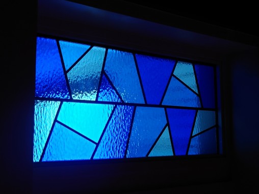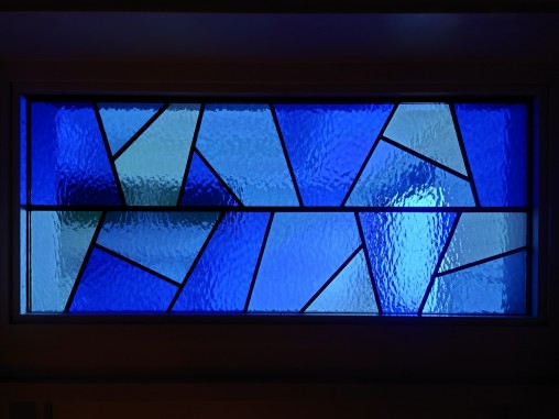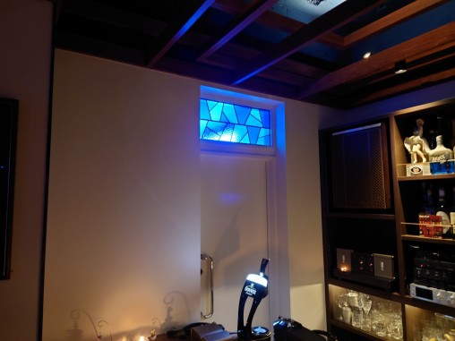 欄間部分はアプローチ部分に設置をさせて頂いた LED内蔵ステンドグラスのデザインに合わせて 開口サイズに合わせてデザインをさせて頂き、 同じ色ガラスは使用して制作をさせて頂きました。 拝啓、戸夢窓屋さん この度は店舗の移転に際し、 素晴らしいステンドグラスを作製して頂き有難うございます! オリジナルのステンドグラスを発注するにあたって、 最初に困ったのは何処の工房にお願いしたらいいのかという事でした。 私のイメージは、マイルス・デイビスの伝説の名曲 『死刑台のエレベーター』を彷彿させてくれるような 『青い空間』を作りたいというものでした。 そんな抽象的なイメージに付き合ってくれるところが果たしてあるのだろうかと 幾つかの工房に連絡。 そして「それは面白い!ぜひ協力させてください」と 返答いただいたのが戸夢窓屋さんでした。 私は九州の大分在住ですが、 バリアフリーのオーセンティック•バーを営んでおります。 戸夢窓屋さんは『芸術作品』を作るのではなく、 店舗のポリシーと全体の設計イメージを十分に考慮しながら、 一緒にデザインを考えて下さった事が有り難かったです。 お陰様でイメージ通りの空間を作る事ができ、 日々お客様に好評を頂いております。 Bar Babymoon 店主 関元健二 |