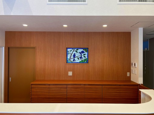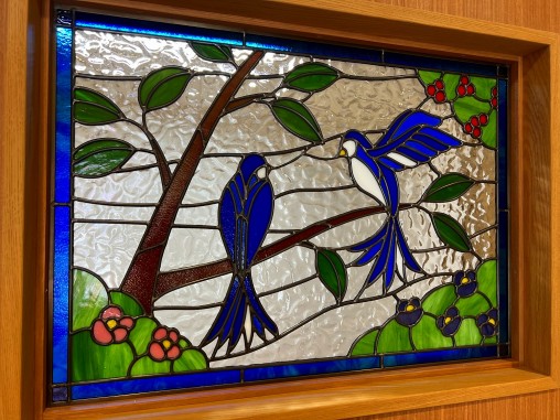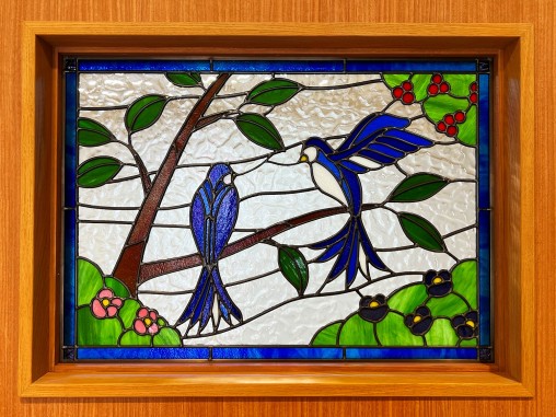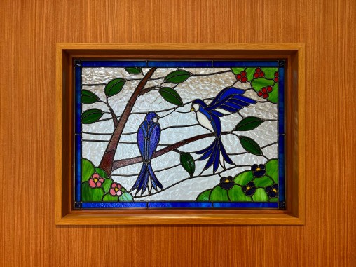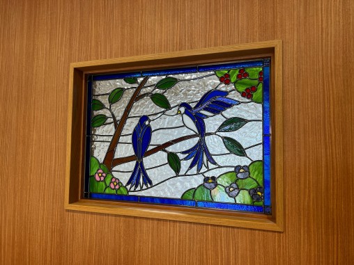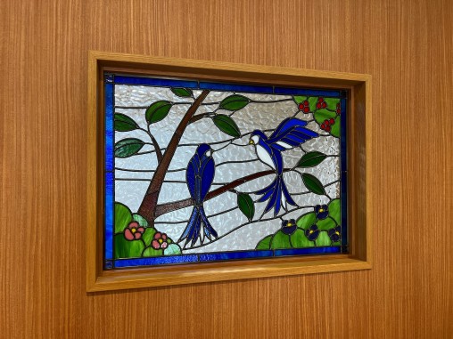 お医者様のご夫婦でクリニックを開業されるにあたり、 入口正面の顔となる受付部分にステンドグラスを 設置されたいのと事でご依頼を頂きました。 患者様に幸せと癒しの意味合いで 「幸せの青い鳥」のデザインをご希望されました、 2羽にされた意味はご夫婦を表現されています。 お客様のスケッチを図案化させて頂いて ステンドグラスを制作させて頂きました、 受け付け側から診察室内部が見えないように 目隠しの強いガラスを使用して制作し、 診察室からの声が受付側に漏れないように 透明ガラスを診察室側に貼り合わさせて設置致しました。 |