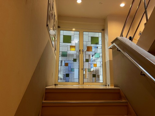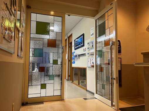 元々は、両開きドアに網入りガラスが入っていましたが 両開きドア2枚の内、片側のガラスが割れてしまい、 そのガラス交換をする際にステンドグラスを設置される事になりました。 ドア2枚ともにステンドグラスを設置される方が綺麗ですので 2枚ともステンドグラスに交換されました。 ガラスが割れている方のドアは、ドア本体にも損傷があった為、 ドアごと交換され、ドアを手配された建築業者様との打ち合わせや 詳細の指示は弊社で対応をさせて頂きました。 今回はガラスのサイズが大きく(約W760×H2000)開閉の頻度も多く、 ステンドグラスを綺麗に見せる為、網入りガラスから5ミリ厚強化ガラスに交換され、 そのガラスにステンドグラスを貼り付ける施工方法で設置をさせて頂きました。 |